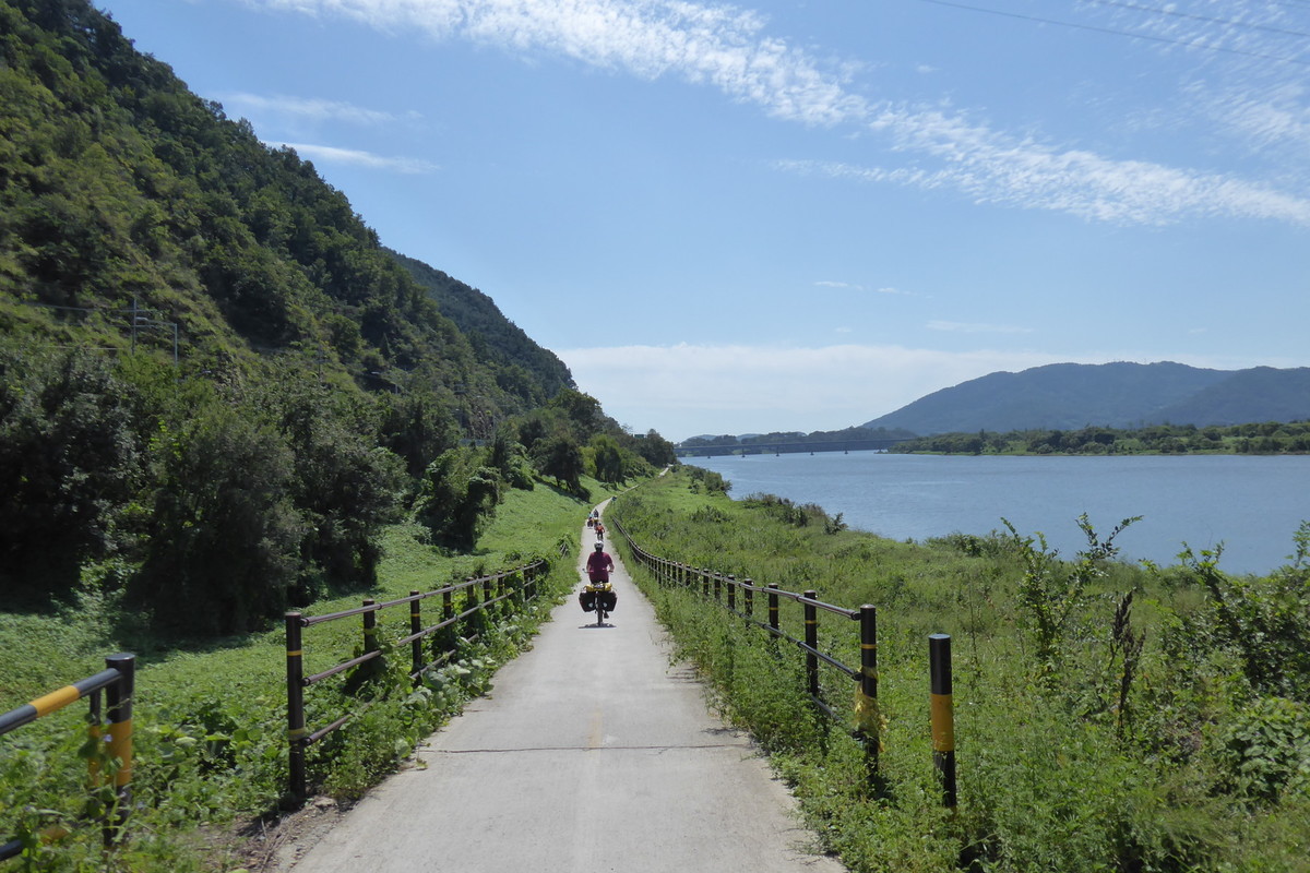 Просыпаемся в городке Куми, стартуем, и снова не перестаем удивляться, как всего через пару оборотов педалей мы оказываемся на уединенной велодорожке, петляющей вдоль холмов и рек. Едем в Дэгу, четвертый по величине город страны, важный транспортный узел еще с начала веков, а ткаже родина Ви и Сюги (как, вы не знаете, это же солисты BTS)
